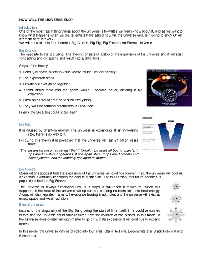 The theory contradicts the most popular concept of our universe's beginning, which suggestsit the big bang model suggests the universe began from what is known as a 'singularity', or a point of. The cosmos will come to a close through a cold and lonely death called the big freeze. The big freeze theory (self.songwriters). It is also known as the future of expanding universe. This wonder was mostly about.